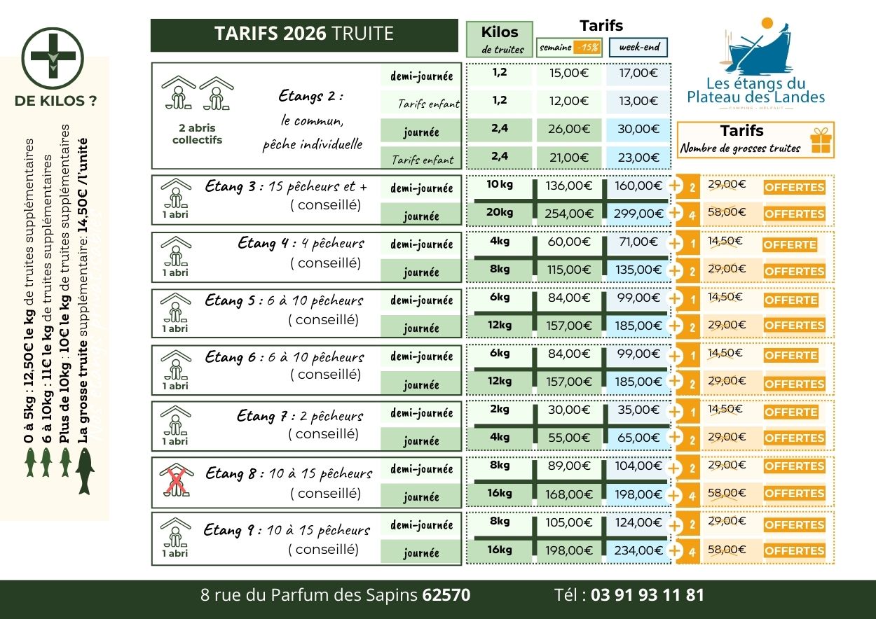 Bienvenue aux Étangs du Plateau des Landes, le lieu idéal pour la pêche à truite ! Venez profiter d’un cadre apaisant pour capturer de superbes truites dans nos étangs parfaitement aménagés. Que vous soyez pêcheur débutant ou confirmé, notre équipe est là pour vous guider. Sur place, vous trouverez 2 hectares de pêche composés de 10 étangs entretenus quotidiennement!